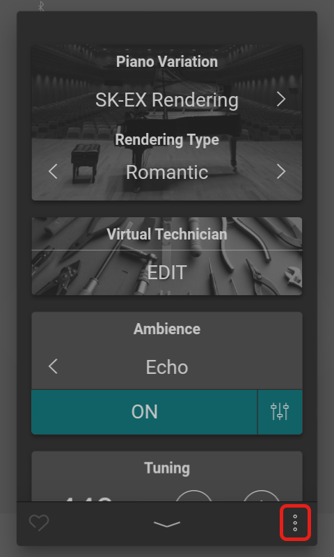 1. From the Piano tab, select the preferred piano type/variation, then open the editor window and make any Virtual Technician etc. adjustments as desired (e.g. "SK-EX Rendering | Romantic", "Dynamic" Voicing type, etc.)